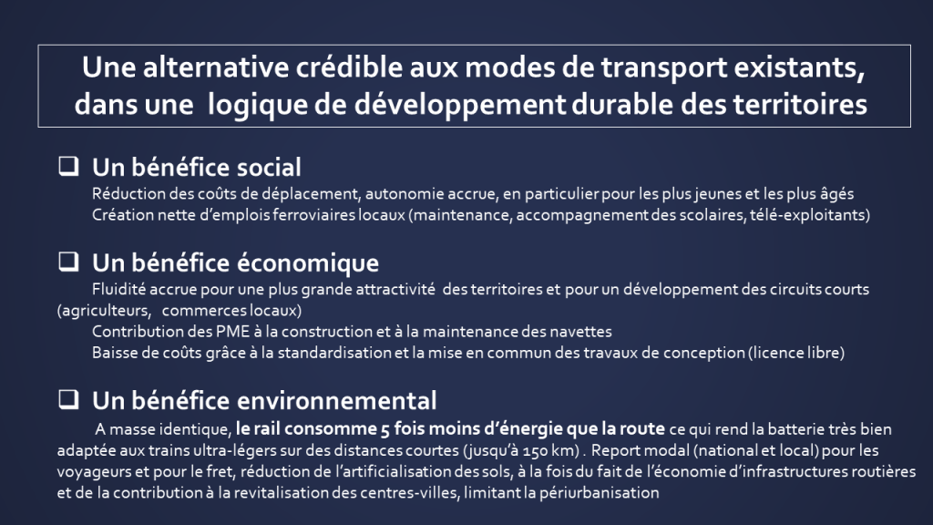 Les infrastructures ferroviaires du début du 20ème siècle alliées aux technologies du numérique redeviennent un atout pour redynamiser, avec les codes du 21ème siècle, le monde rural. Ce projet lancé en 2018 a fait des émules : des industriels Français sont prêts à relever le défi, plusieurs lignes sont à l’étude dans le sud de la France pour un projet multimodal (train + voitures électriques) avec le soutien engagé des autorités régionales concernées. Objectif : 8 AR par jour + des navettes à la demande jour et nuit et une exploitation courante à l’équilibre financier pour un prix de transport annuel divisé par 2 pour les usagers. Objectif environnemental : 2t de C02 par véhicule évité.