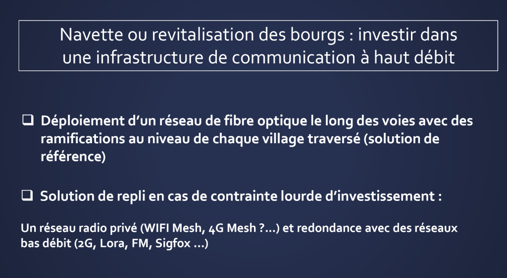 Les fonctions de reprise à distance du pilotage de la navette , de sécurité des espaces voyageur, imposent des réseaux de télécommunication publics redondants et performants . Chaque gare doit disposer d’une arrivée de la fibre optique, à défaut d’une liaison de communication radio publique adaptée (5G) ou à défaut un réseau radio privé (WIFI MESH, par exemple). Le déploiement des réseaux publics contribue à la réduction de la fracture numérique du territoire concerné . L’installation d’un réseau de fibre optique (solution de référence) peut bénéficier de coût partagés avec la nécessaire régénération de la voie . La fibre est un facteur de revitalisation des territoires ruraux traversés par la ligne: un investissement de long terme à préférer aux solutions de radio privé moins onéreuses mais limitées au fonctionnement de la navette